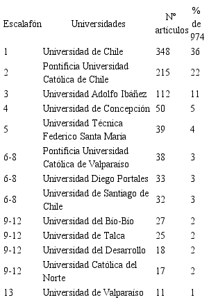 Chile se ubica en segundo lugar a nivel de la región latinoamericana en la etapa analizada, después de Brasil, de acuerdo con su producción científica en las disciplinas objeto de este estudio. La Tabla I muestra las universidades más destacadas. Los resultados son similares a los reportados por Merigó et al. (2016) sobre los resultados de la innovación en las universidades chilenas.