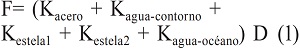 La incertidumbre (u) del cálculo involucra: u1 del estado friccional del casco debido a incrustaciones marinas, se considera u1=0 porque el casco estaba recubierto con una capa de plomo, que es tóxico para la vida marina; u2 del mallado de elementos finitos: al emplear 20000 elementos en el programa ALGOR se tenía la mejor resolución (la diferencia con 18000 elementos era de un 2,5% en resultados) por lo que el máximo de incertidumbre en este caso sería u2= 2,5; u3 debido al modelo de 4 capas: anteriormente con una capa (en vidrio líquido) se había determinado una discrepancia de 2% en el modelo de Hartley respecto a los resultados experimentales (Ponce,1986), por lo que empleando 4 capas de agua la incertidumbre debe ser menor, luego el valor máximo solo alcanzaría a u3= 2. Incertidumbre dimensional u4: si se estima una diferencia de 1%, en las dimensiones de los planos respecto a las dimensiones del buque construido, u4= 1. La incertidumbre total alcanzaría u= u1 + u2 + u3 + u4 = 5,5 en el peor caso, que es menor a la cifra exigida en ingeniería, de u= 7. Respecto a las condiciones de borde, el casco fue fijado para luego darle un movimiento impuesto de 3m; la respuesta del programa son fuerzas, como indica la Ec. 1. Las condiciones de borde para fijación del agua oceánica se estimaron en base al principio de atenuación de cargas de Saint Venant por el efecto de distancia.