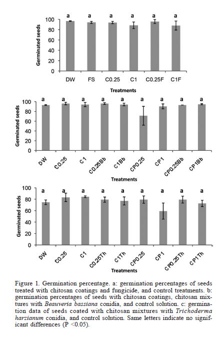 The success of chitosan as a retaining agent for the development of seed coatings with agrochemicals and biological agents was confirmed. Germination of bean seeds was not affected using chitosan coatings. Conidia germination of B. bassianawas higher than that of T. harzianum, which indicates differential sensitivity to chitosan. Success of seed coatings depends on many factors, including surface characteristics, architecture of seed surface, presence of trichomes, seed physiology, additive nature of chitosan, seed genetics and propagules or microorganism responses. Therefore, it is important to emphasize the need for a holistic perspective in generating coatings and studying their effect on germination stages subsequent to determining their impact on the establishment of the seedlings and on the rhizosphere.