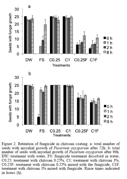 Because chitosan has been suggested as an agent for retention and gradual release of various compounds, the ability of shrimp chitosan to retain Ziram® fungicide on the surface of bean seeds was assessed. A total of 200 seeds per treatment were coated by individual immersion in the corresponding solution for 2-5s and dried for 24h at room temperature (28-30ºC). A group of 50 seeds per treatment was reserved until use, the remaining 150 per treatment were washed in sterile distilled water. The fungicide retention test was related to permanence of the fungicide effect on seeds from treatments FS, C0.25F and C1F after washing with sterile water. Groups of 150 seeds per treatment were placed in containers with 500ml of sterile distilled water, which was changed every 2h over an 8h period. After 1h, 50 washed seeds per treatment were removed; after 2h, another 50 seeds per treatment were removed; and finally, after 8h, the last 50 seeds per treatment were removed. All seeds were dried for 1h at room temperature (28-30ºC) inside a laminar flow hood. Each 50-seed treatment had different exposure times to rinses. To determine permanence of the fungicide, all rinsed and dried seeds were placed in Petri dishes with potato dextrose agar (PDA, Bioxon) culture medium forming two groups of 25 seeds (experiment in duplicate). Then, each seed was inoculated individually with 10μl of a solution of Fusarium oxysporum conidia at a concentration of 1×105 conidia/ml. Conidia were harvested by washing the surface of a 5 days old F. oxysporum culture with 15ml of 0.05% Tween 80 (Sigma- Aldrich) sterile solution. Conidia concentration was adjusted to 1×105. Petri dishes with inoculated seeds were incubated 72h at room temperature (28-30ºC). Presence of mycelial growth on seeds was related to conidia germination, and seeds with mycelial growth from treatments FS, C0.25F and C1F were considered to have lost fungicidal effect.