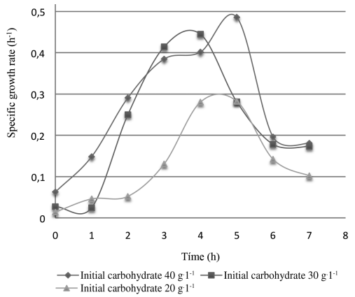 (3)where µ: specific growth rate (h-1), µmax: maximal specific growth rate (h-1), Ks: saturation constant (g·l-1), S: substrate concentration (g·l-1), X: S. cerevisiae biomass in g·l-1, and t: sampling time (h). Subscripts i and o: initial and final, respectively.