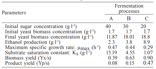 The production of bioethanol using Saccharomyces cerevisiae as a fermenting microorganism and Gracilaria sp. as a sole carbon source has been recently studied (Kumar et al., 2013). However, there are no studies on the kinetic parameters of this yeast with Gracilaria chilensis for ethanol production. In this study, the main fermentation kinetic growth parameters, including specific growth rate, maximum specific growth rate, affinity constant, biomass yield and product yield of fermentation processes for the production of bioethanol were evaluated.
