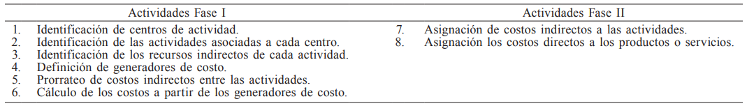La metodología de las dos fases contiene fases y etapas. En una primera fase se determinan los costos de las actividades de cada centro de costo considerando seis etapas, en su segunda fase, la cual está compuesta de dos etapas, se determinan los costos de los productos (Sanhueza, 2015). Evidencia empírica de la aplicación efectiva de la metodología de las dos fases se encuentra en el ámbito del mantenimiento de una termoeléctrica (Ormeño, 2010), en la explotación de los procesos de producción y distribución de agua potable (Chacana, 2008), y en Cuevas et al. (2004) se evidencia la aplicación de esta metodología en servicios de salud.