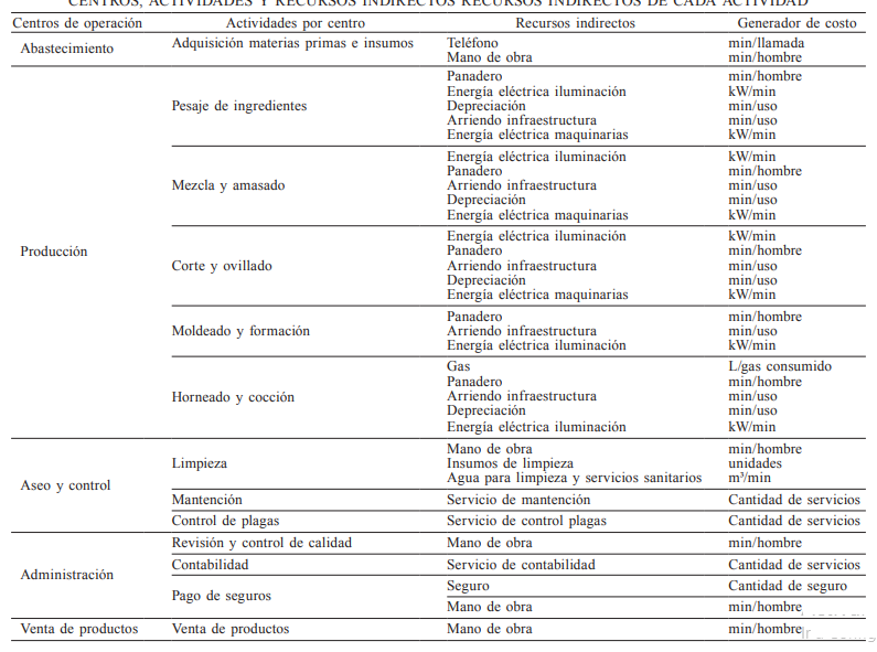 El proceso de producción de una panadería admite la identificación de centros de operación, actividades por centro y actividades asociadas con costos directos e indirectos, así como generadores de costos afines al proceso de producción.