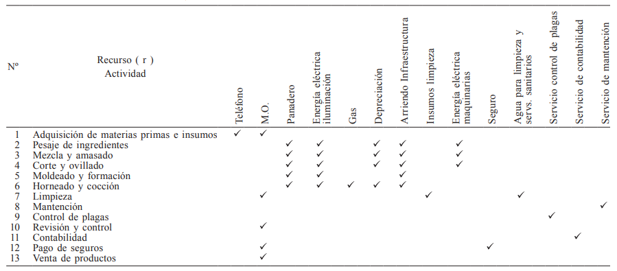 El proceso de producción de los tres tipos de producto bajo análisis fue posible organizarlos en base a cinco centros de operación, trece sub-actividades y catorce tipos de recursos indirectos. El detalle de los centros de operación, actividades por centro, recursos indirectos y generadores de costo, se indica en la Tabla II. El prorrateo de costos indirectos se realizó según las indicaciones del administrador de una panadería local, recurriendo a una matriz de doble entrada, identificándose catorce tipos de recursos y trece actividades, como se indica en la Tabla III.