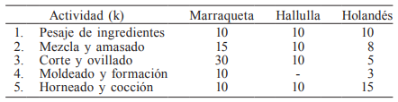 Por otra parte, para la determinación de los costos indirectos asociados con las trece actividades, se consideró una duración para cada uno de los seis centros de actividad (Tabla V), los porcentajes panadero (Tabla VI) y los tipos de ingredientes para los productos bajo análisis (Tabla VII).