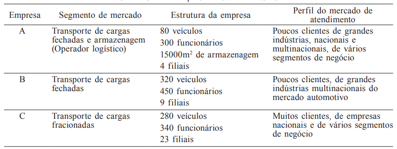 A operacionalização na coleta de dados ocorreu basicamente de três formas: entrevistas (semiestruturadas, com questões abertas) com os gestores operacionais das transportadoras, documentação (arquivos e relatórios) e observações diretas in loco. Quanto a unidade de análise, a pesquisa concentrou seus esforços em analisar três empresas do mercado de serviços de transporte rodoviário de cargas sendo uma empresa do segmento conhecido por ‘carga fechada’ uma empresa do segmento ‘fracionado’ e uma empresa que além do transporte também realiza processo de armazenagem (operador logístico).