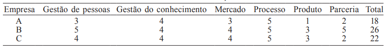 A pesquisa apontou que a dimensão gestão de pessoas, importante para a estruturação de um ambiente ideal para a inovação é vista de maneira diferente pelas empresas alvo da pesquisa. Nas empresas A e C, a gestão de pessoas praticamente não existe, não há investimentos em políticas de capacitação e nenhuma avaliação de desempenho é realizada para monitorar a performance dos colaboradores. Os gestores das áreas não possuem autonomia para com os seus comandados, tendo que compartilhar a tomada de decisão com a direção da empresa. Como não existe um processo de capacitação profissional planejado, treinamentos ocorrem somente quando demandados por algum evento específico. Este cenário para a gestão de pessoas encontrado nas empresas A e C segue linha contrária em relação aos pensamentos de Birasnav et al. (2013), que pregam que a autonomia e a tomada de decisões rápidas fornecem velocidade para a inovação e que o ambiente inovador é mais intenso quando as lideranças percebem a importância da capacitação sistemática do colaborador, preparando para que este possa tomar decisões rápidas que resultem em melhorias para processos, produto e sistema.