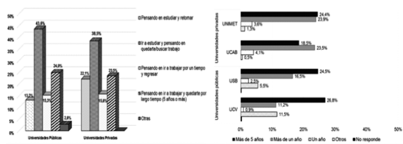 El relevamiento de los datos se realizó en dos universidades públicas y dos privadas de la región capital. Se encuestó a grupos de estudiantes en cuatro áreas del conocimiento (ciencias de la salud, ciencias sociales, ciencias básicas e ingenierías). Los resultados indican que Venezuela estaría perdiendo porcentajes significativos de los nuevos cuadros de profesionales en el corto plazo. En ese escenario, el país estaría hipotecando su desarrollo, al no tener estrategias de geolocalización y vinculación con los que emigran.