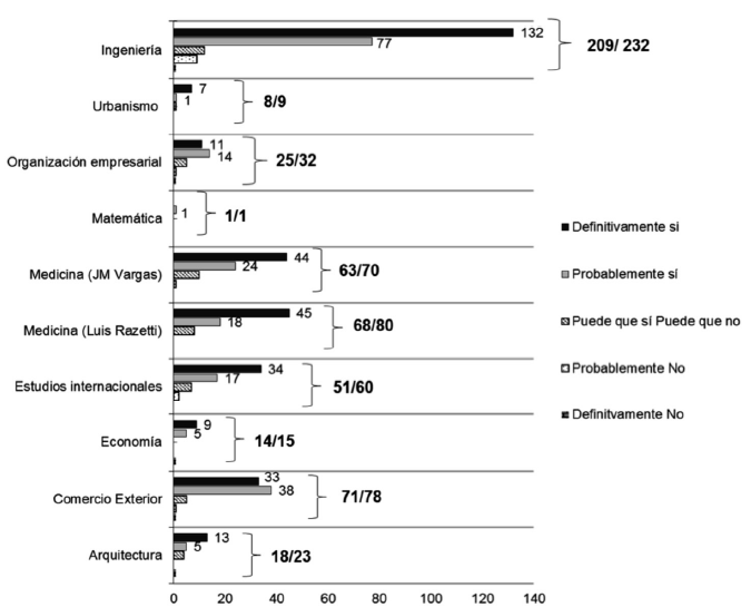 La Figura 6 responde a la pregunta referida a si tiene intenciones de emigrar y se cruzó con la carrera de estudios (solo en la muestra de universidades públicas) para analizar si existen perfiles de preferencia según esta variable. Al no contar con el mismo número de respuestas control por carrera, se analizó cada variable contra su total. Es claro que en todas las carreras las respuestas ‘Definitivamente si’ y ‘Probablemente si’ representan más del 86% en todos los casos y ese porcentaje ratifica la secuencia de las respuestas analizadas en este estudio sobre la situación que vive Venezuela.