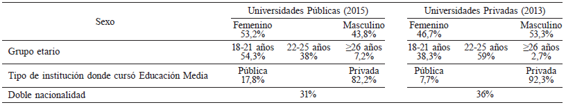Al establecer el perfil de los estudiantes encuestados (Tabla I), tanto en las universidades privadas como públicas se aprecia, en primer lugar, las diferencias de género, debido a que en las universidades públicas predominan las mujeres con un 53,2% y en las privadas los hombres con 52,3%. No obstante, se pudiera establecer que ese diferencial en materia de género no es de gran proporción entre los tipos de institución, por lo que no ejerce ningún tipo de influencia en las decisiones de emigrar. Al revisar los grupos etarios de los estudiantes por tipo de institución, se observa que en las universidades públicas el segmento entre 18 y 21 años de edad representa el 54,3%, mientras que en las privadas es el 38,3%, en cuanto al grupo etario de 22- 25 años, las públicas presentan un 38% y las privadas un 59% de estudiantes, lo que significa que aquellos estudiantes que responden tener intención de emigrar, su edad está concentrada en más del 85%, entre 18 y 25 años. Al examinar el porcentaje de estudiantes con doble nacionalidad por tipo de institución, el 31% de estudiantes en las públicas y el 36% de estudiantes en las privadas cuentan con, al menos, doble nacionalidad. Eso significa que, en promedio, un tercio del total de encuestados tiene posibilidad real de insertarse en otro país y cuenta con lazos familiares que pueden utilizar, en teoría, bajo la denominación de lo que se conoce como migración remolque si esa fuese su intención.