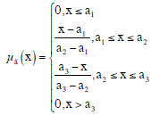 (1)onde a1, a2 e a3:números reais e a1<a2<a3. O valor de x em a2 apresenta um grau máximo de μã(x), como por exemplo, μã(x)=1. O valor de x em a1 apresenta o grau mínimo de μã(x) como por exemplo, μã(x)=0. As constantes a1 e a3 representam o limite inferior e superior, respectivamente. Essas constantes refletem os atributos de avaliação, em que quanto menor for o intervalo [a1, a3], maior será a precisão dos dados de avaliação (Liang, 1999).