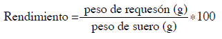 Al finalizar la etapa de escurrido, se obtuvo el peso del requesón y con la Ec. 1 se obtuvo el rendimiento para cada uno de los tratamientos: