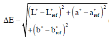 El color del requesón se midió con un equipo Chroma meter (Konica Minolta®, Mod. CR-410, Japón) evaluándose los parámetros L*, a* y b*. El valor L* es un indicador de luminosidad (de negro a blanco), el valor a* es un indicador que va desde el color verde (valores negativos) hasta el rojo (valores positivos) y el valor b* indica tonalidades desde el color azul (valores negativos) hasta el amarillo (valores positivos). La muestra se colocó sobre una superficie circular blanca cubriéndola completamente con el requesón, al momento de realizar la prueba se cuidó que la iluminación de la habitación fuera lo más baja posible para que la luz no interfiriera con las lecturas. Este procedimiento se realizó por triplicado para cada uno de los tratamientos (Ruiz-Marroquín, 2006; Wadhwani y McMahon, 2012). Además, se calculó la diferencia de color (simbolizada como ΔE*) del requesón para cada uno de los tratamientos, usando el promedio de las lecturas de los parámetros L*, a* y b* por medio de la Ec. 2, tomando como referencia el tratamiento control (Ramírez-Navas y de Stouvenel, 2012).
