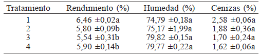 Se siguió un diseño completamente al azar con un factor y las variables de respuesta fueron rendimiento, humedad, cenizas, color, dureza y adhesividad. Los datos fueron analizados a través del procedimiento ANOVA. Posteriormente, se realizó la comparación múltiple de medias por medio de la prueba de Tukey, en donde las diferencias estadísticamente significativas fueron establecidas mediante un valor de α= 0,05. El paquete estadístico que se utilizó fue el programa SAS versión 9.1.3 (SAS Institute Inc., EEUU, 2006).