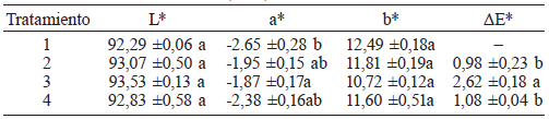 Para los valores de b* (valores positivos indican tendencia al amarillo y valores negativos tendencia a las tonalidades azules) no se encontraron diferencias significativas entre los tratamientos. Los valores en este proyecto se encontraron entre 10,72 y 12,49 siendo similares a los encontrados por Ruiz-Marroquín (2006), quien reportó valores alrededor de 12. Como los valores fueron positivos en ambos trabajos, la coloración del producto presentó mayor tendencia al amarillo.