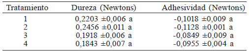 La dureza y adhesividad del requesón fueron determinadas con un texturómetro TA.XT-Plus (Stable Microsystems®, RU). El requesón se depositó en un recipiente de vidrio de 10cm de profundidad hasta llenarlo completamente y se comprimió utilizando el aditamento cónico TA-15A (cono de acrílico de 45º). Las condiciones empleadas fueron: velocidad de la prueba de 1mm·s-1 y distancia de desplazamiento de 10mm. Los datos que se obtuvieron de dureza y adhesividad de la muestra se expresaron en Newtons.