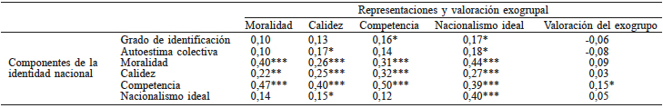 La tendencia descrita varía un poco cuando se analiza la relación entre las medidas ideológicas y la representación y valoración del exogrupo nacional. Así, en el caso peruano se aprecia que el RWA se asocia inversamente con la valoración del exogrupo chileno (r(210)= -0,17, p<0,05) mientras que la SDO se asocia inversamente con todos los componentes de la representación del exogrupo como: Moralidad (r(193)= -0,14; p<0,05), Calidez (r(198)=-0,20; p<0,01), Competencia (r(191)= -0,23; p<0,01) y Nacionalismo ideal (r(197)= -0,21; p<0,01), así como con la Valoración del exogrupo chileno (r(197)= -0,21; p<0,01). Por su parte, en la muestra chilena, tanto el RWA como la SDO se asocian inversamente con la Valoración del exogrupo peruano (r(174)= -0,27; p<0,001 y r(160)=- 0,27, p<0,001; respectivamente).