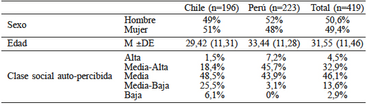 Participaron en el estudio 419 personas; 223 (53,2%) de los participantes eran naturales de Perú y 196 (46,8%) eran naturales de Chile. El 50,6% del total de la muestra estuvo conformada por hombres. Las edades de los participantes fluctuaron entre los 17 y 71 años (media ±desviación típica de 31,55 ±11,46). Considerando la condición socio-económica, la mayoría de los participantes en el estudio se autoclasificó como de clase media (46,1%) y en segundo lugar como de clase media-alta (32,9%). La Tabla I presenta las características demográficas de las muestras.