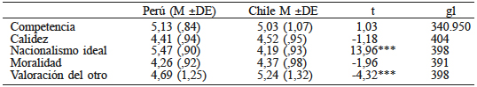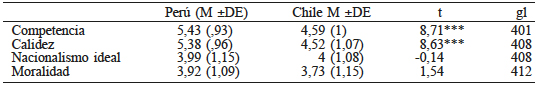 A pesar de lo anterior, existen diferencias significativas en las representaciones estereotípicas y valoración del exogrupo que presentan los participantes de las dos muestras. De manera específica, los peruanos perciben a los chilenos como con más nacionalismo ideal y los chilenos valoran mejor a los peruanos. Las otras dimensiones evaluadas no presentan diferencias por país, tal como se muestra en la Tabla IV.