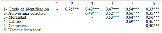Por su parte, en la muestra chilena se aprecia que el RWA también se asocia con todos los componentes de la identidad nacional: con Grado de identificación (r(184)= 0,29; p<0,001), Autoestima colectiva (r(180)= 29; p<0,001), Moralidad (r(179)= 0,18; p<0,05), Calidez (r(180)= 27; p<0,001), Competencia (r(176)= 0,16; p<0,05) y con Nacionalismo ideal (r(181)= 0,20; p<0,01). Adicionalmente, en el caso chileno se hay asociaciones positivas entre la medida SDO y la Autoestima colectiva (r(166)= 0,21; p<0,001), y la SDO y el Nacionalismo ideal (r(169)= 0,16; p<0,05).