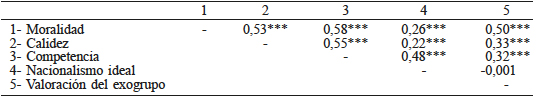 A nivel correlacional se muestra que existen asociaciones positivas entre los distintos componentes del estereotipo y la Valoración exogrupal, con excepción de la relación de la representación del exogrupo como con Nacionalismo ideal y Valoración del exogrupo nacional (Tabla V).
