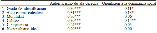 Se realizaron análisis de correlación de Pearson para establecer la asociación entre las medidas de SDO y RWA con los distintos componentes de la identificación nacional. Los resultados revelan para la muestra general que el autoritarismo de derecha tiende a relacionarse positivamente con todas los componentes de la identidad nacional, mientras el indicador de dominancia social se relaciona positivamente con el Grado de Identificación, la Autoestima colectiva y el Autoestereotipo de calidez (Tabla VI). Se observa que los tamaños del efecto de las relaciones entre el indicador de SDO son consistentemente menores que los del RWA.