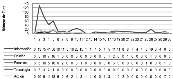 En Twitter, los primeros tuits observados provinieron de usuarios vinculados a instituciones con competencia en situaciones de emergencia, autores que indicaban ser la voz oficial durante el desastre. La cantidad de emisores y la alta frecuencia de sus mensajes marcaron la categoría con mayor presencia durante todo el análisis y que surge inmediatamente acontecido el terremoto. La categoría ‘Información’ resultó ser la posición que concentró la mayor cantidad de mensajes (71,6% del total de tuits en todas las categorías durante el período observado), lo que permitió dar cuenta de la preferencia de las personas por informarse y dar a conocer, a través de esta red social, datos útiles en un contexto de desastre. Los usuarios de Twitter realizaron las interacciones prosumidoras, es decir, autores que producían y consumían información creíble por medio de mensajes desde y para la zona afectada (Arcila y Said, 2012; Thomson et al., 2012). Los tuiteros informaron desde las primeras horas de ocurrido el desastre respecto al peligro frente al inminente colapso de infraestructura pública y habitacional, conectividad vial, provisión de servicios básicos urbanos y puntos de entrega de recursos de primera necesidad (agua, alimentos y abrigo), los que escasearon durante una semana después de ocurrido el terremoto. El punto máximo de emisión de mensajes se identificó el 2 de abril, que coincide con dos sucesos importantes: la llegada de la luz diurna, lo que permitió contemplar con claridad las consecuencias del desastre, y la ocurrencia de una réplica de gran intensidad (7,6º), considerada por los expertos como un segundo terremoto (CSN, 2014).