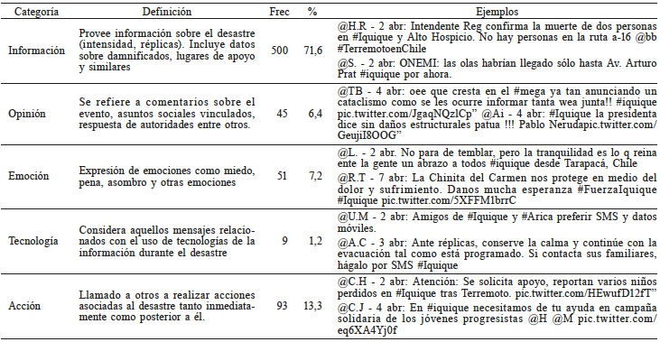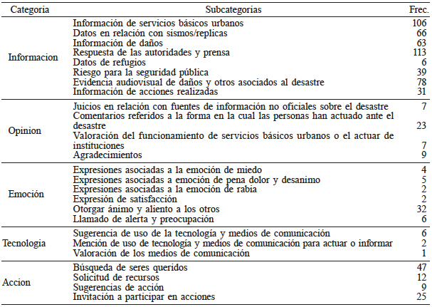 En el análisis cualitativo de contenido se utilizaron como categorías iniciales para la codificación, las expuestas por Heverin y Zach (2012), las cuales fueron ajustadas al evento terremoto, pero conservando su delimitación original (Tabla I). Posteriormente, se realizó un segundo análisis cualitativo para establecer subcategorías que permitieran describir con mayor detalle las categorías iniciales, siguiendo la metodología expuesta por Cáceres (2003).