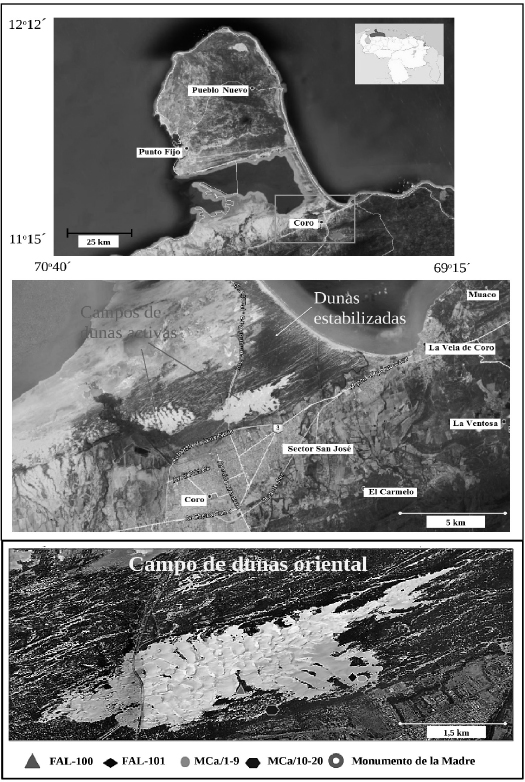 Las localidades estudiadas comprenden dos áreas de recolección (Figura 1): MCa/1-9, se encuentra en las inmediaciones de la Plaza de la Madre (11º26´05”N, 69º38´53”O), abarcando el tope y los flancos de una duna activa y presenta una gran cantidad de material cultural de diferente naturaleza aflorado en superficie. Se trata de una amplia zona con material cultural aflorado que mostró continuidad espacial en las exploraciones de campo realizadas a lo largo de año y medio, abarcando 5ha. Esto permitió inferir que estas áreas de recolección muy probablemente representan un yacimiento único. Este se encuentra en el área más turística del Parque y es evidente que ha sido saqueado. Para incluir estas áreas de recolección en nuestras investigaciones se sopesó la gran extensión que abarcan, la gran diversidad de material cultural hallado, y el oscurecimiento marcado de la arena hacia el centro del área aflorada, como claro indicador de la alteración de las variables del suelo. De hecho, en el campo se estimó que el bolsón o parche donde el suelo se presenta oscurecido, abarca aproximadamente un cuarto de hectárea. El color esta modificado hasta los 30cm de profundidad en algunas zonas. En la Figura 2 se presenta una vista general y el detalle de parte del material cultural aflorado. Esta localidad, (Figura 1) además, coincide en su flanco noroeste con el sitio FAL101 de Oliver (1989).