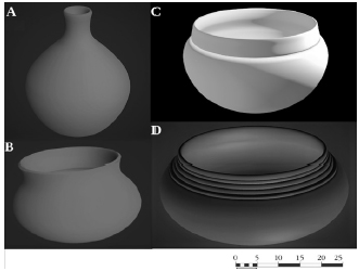 a: botella, b: bol simple., c: olla de borde acintado simple, d: olla con borde multiacintado. Escala en cm.