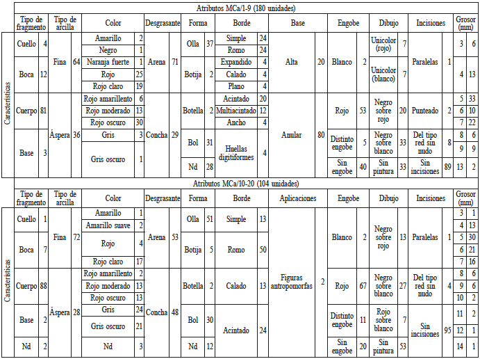 Elaboración: Miguel ZavalaTambién se hallaron importantes diferencias entre las áreas de recolección. En primer lugar, los restos de cerámica de mayor tamaño se colectaron en MCa/10-20, y aunque la cantidad de fragmentos decorados fue poca en ambos sitios (con apenas ocho fragmentos en MCa/1-9 y siete en MCa/10-20), en MCa/1-9 se contabilizaron casi el doble de piezas por unidad de área que en MCa/10-20. Por lo tanto, la proporción de piezas decoradas en el segundo sitio fue sensiblemente superior que en el primero. La arcilla fina y el desgrasante de concha predominaron en MCa/10-20. La calidad de cocción de la pasta se diferenció también entre ambos sitios. Las piezas utilitarias y de posible uso de cocina, con cocción y oxidación incompleta, fueron más frecuentes en MCa/1-9 que en MCa/10-20. Por el contrario, las piezas con mejor acabado, como pulido, engobe y pintura, y que muestran la cocción con oxidación completa, se hallaron con mayor frecuencia en MCa/10-20.