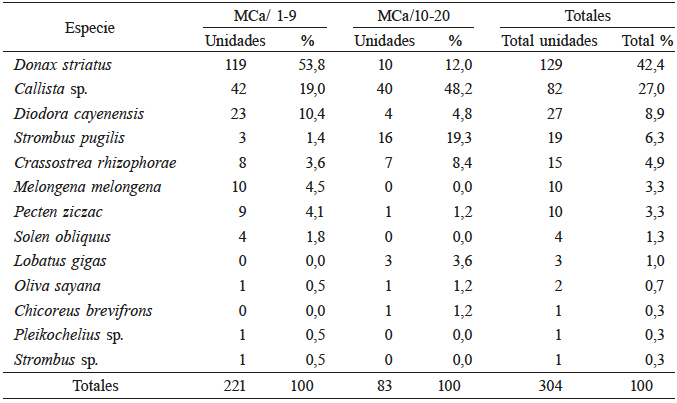 En cuanto a las conchas de malacofauna (Tabla II), cabe destacar la presencia de 11 especies en MCa/1-9, con un predominio de Donax striatus. En MCa/10-20 se hallaron 9 especies, con Callista sp. y Strombus pugilis como elementos dominantes. La densidad de conchas por unidad de área presente en MCa/1-9 fue mucho mayor a la presente en MCa/10-20. En algunos casos se hallaron restos de conchas tallados como cuchillos o raspadores, de acuerdo a las comparaciones hechas con aquellos descritos por Tamayo (1929), Sanoja y Vargas (1974) y Arvelo y Oliver(1999), o que fueron aparentemente utilizados con fines ornamentales (cuentas de collar). Sin embargo, la mayoría de los fragmentos de concha parecen ser restos de la dieta cotidiana.