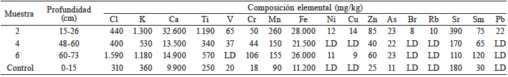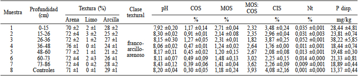En las Tablas III y IV se presentan los resultados de los análisis fisicoquímicos y de composición elemental del suelo. Se apreciaron variaciones significativas al comparar los contenidos de COS, MOS, Nt y P disp., entre las tres muestras más superficiales del perfil de suelo (0-36cm) y las muestras profundas del perfil y las controles. Es evidente, al comparar las medias con sus desviaciones estándar, que las diferencias entre las muestras del perfil y los controles son significativas para las variables y profundidades mencionadas. En el caso del Nt los valores fueron más elevados que en los controles, en todo el perfil de suelo. Los análisis de TXRF muestran el enriquecimiento en K, Mn, Fe y Ca, entre otros elementos, en las muestras del yacimiento con respecto a las muestras control.