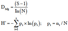 To estimate the species richness index of Margalef (1958; DMg) and the species diversity index of Shannon-Weiner (Shannon y Weaver, 1949), the following equations were used: