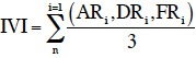 Species abundance (ARi) was determined according to the total number of individuals per species, dominance (DRi) was based on the average crown cover (horizontal ground projection from the aerial section), and frequency (FRi) was based on the species presence within each sampling site. Relative values of these variables were used to obtain the Importance Value Index (IVI), which represents a weighted value of the level of taxon representativeness expressed as percentage on a scale of 0 to 100 (Müeller and Ellenberg, 1974) defined by the following equation (Whittaker, 1972):