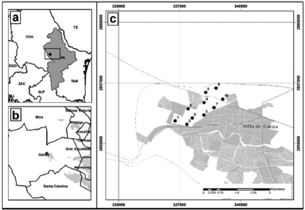 a: Northeastern Mexico and Southeastern United States; b: the municipality of Garcia, Nuevo Leon; c: the spatial location of the sampling sites.