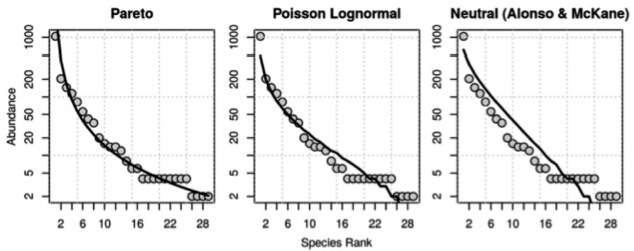 From left to right, the first plot is the Pareto model with best fit to the observed data indicating high abundance for few species and low abundance for most species; the second is the Poisson lognormal and the third is the neutral model, both are showing a similar behavior, at the end of the distribution they tend to misfit the data distribution.