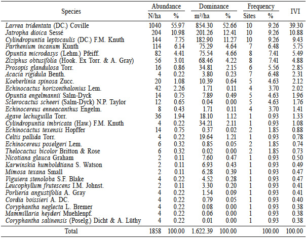 The high number of families (12) and genera (24) recorded in this study can probably be attributed to the overall structural complexity of the bushland (Humphries et al., 1995; MacGillivray and Grime, 1995). For example, extremes of abiotic factors such as high and low temperatures, have strong impacts on the establishment of seedlings in these arid environments. The interaction of unpredictable extreme temperatures and the prolonged droughts have been found by others to be determining factors in the structure and function of plant communities in arid zones (Jordan and Nobel 1979; Rundel and Gibson 1996; PockMan and Sperry, 1997; Hamerlynck et al., 2000; Zúñiga-Vásquez et al., 2017). According to Challenger and Soberón (2008), these types of communities, have plant groups with neotropical affinity (37%), are especially rich in endemics, 44% at the genus level growing to 60% at the species level. These types of vegetation are among the most important in Mexico because of their expanse and contribution to the endemic flora of the country. The results of this research show that the species with the highest importance value is Larrea tridentata (IVI= 39.09), which is in accordance with those of other authors (Granados et al., 2011; Pompa-García et al., 2017), who note that it is a species that dominates the landscape with respect to its density (individuals/ha) and its canopy cover (m2·ha-1).