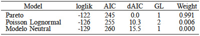 The distribution of species abundance is described by using three models: the Pareto model, the Poisson model of normal lognormal series and the Neutral Model of Alonso and Mackane (Alonso and McKane, 2004). The three models were fitted according to the maximum likelihood method, using the R software (R Core Team, 2016), via the R Studio interface (R Studio, version 0.99) and the Species Abundance Distributions (SADs package, version 0.2.4.). The model selection was conducted by visual and statistical methods, via the following steps: 1) the predicted behavior of the data was evaluated by graphically observing the similarity or difference of the distribution of data against the theoretical distribution; 2) a comparison was undertaken of models selected by the Akaike Information Criterion (AIC), which takes into account the statistical adjustment and complexity. When two models are compared with this statistical selection method, the best model is chosen based on the lower value in the AIC and the delta AIC (dAIC) in comparing models based on the outcome of AIC, minus the minimum AIC. If dAIC<2 there is no difference between the models (Kindt and Coe, 2005).