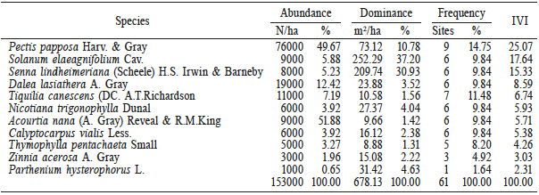 The herbaceous stratus presents a DMg= 1.36, and an H’= 1.76. Also, this stratus showed a species richness (S) of 11, a density of 153,000 individuals/ha, and a total coverage of 678.13 m2 ha-1. Pectis papposa Harv. & A. Gray, Solanum elaeagnifolium Cav., Senna lindheimeriana (Scheele) H.S. Irwin & Barneby, Dalea lasiathera A. Gray, and Tiquilia canescens (A. DC.) A.T. Richardson were the most important species, accounting for 73.37% of the IVI (Table IV). No IVI for herbaceous species was <1%, and Parthenium hysterophorus L. had the lowest recorded value of IVI (2.31%).