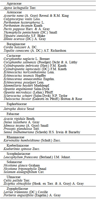 A total of 40 species belonging to 33 genera and 12 families of vascular plants were recorded (Table I). The families with the most species were Cactaceae (13), Asteraceae (8) Fabaceae (5) and Solanaceae (3); these families accounted together for 72% of the species recorded in the study.