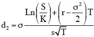 (1)donde S: precio del activo subyacente en el momento actual, K: precio de ejercicio del activo subyacente, r: tasa de interés anual libre de riesgo, T: tiempo hasta el vencimiento, σ: volatilidad anual, y d2: valor de la abscisa en una distribución normal estandarizada.