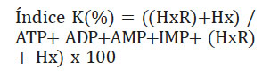 La identificación y cuantificación de los nucleótidos, nucleósidos y bases nitrogenadas se llevó a cabo por cromatografía líquida de alta presión (HPLC) de acuerdo con la metodología descrita por Ryder (1985). Se detectaron los siguientes compuestos: adenosina 5’ trifosfato (ATP), adenosina 5’ difosfato (ADP), adenosina 5’ monofosfato (AMP), inosina (HxR) e hipoxantina (Hx), con los que se procedió a calcular el índice K, de acuerdo con la ecuación propuesta por Sagedhal et al. (1997):