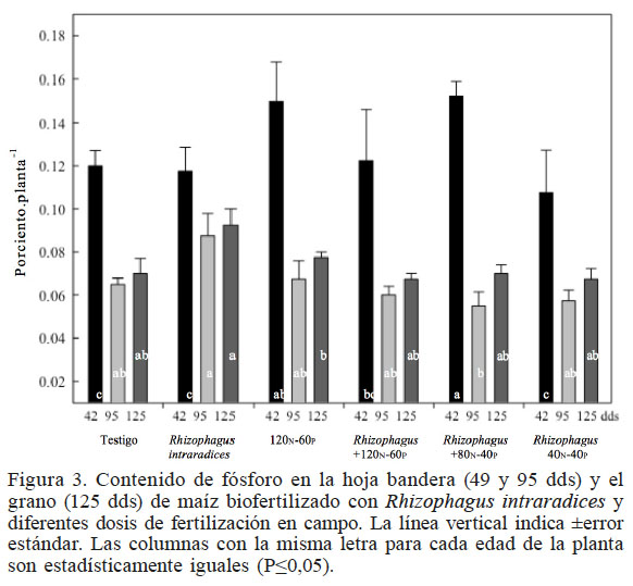 En cambio, la dosis más baja presentó rendimiento semejante al tratamiento unicamente con R. intraradices. Resultados semejantes cita Cruz-Chávez (2010) en la Región Centro de Chiapas, pues al disminuir la aplicación del fertilizante de 100-50-00 a 50-20-00 más R. intraradices reporta incremento en rendimiento de 16% con el tratamiento micorrizado. En determinadas condiciones de campo, se ha estimado que es posible disminuir el fertilizante fosfatado recomendado y complementarse con la inoculación de los hongos micorrízicos.