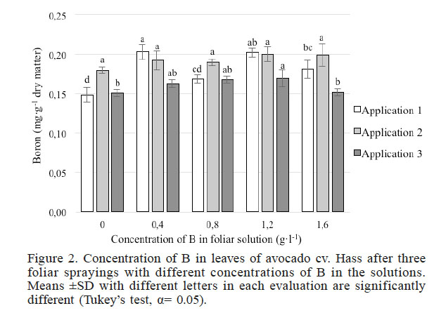 The concentrations of B recorded in the leaves ranged between 0.148 and 0.203mg·g-1 of dry material (Figure 2), which is considered optimal in orchards of avocado cv. Hass with yields exceeding 20t·ha-1, according to Maldonado-Torres et al. (2007).