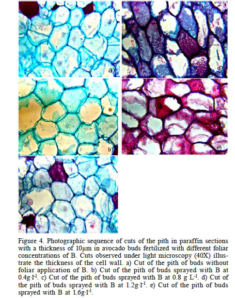 The images in Figure 4 show the similarities in the cell wall thicknesses between the treatment with the lowest B concentration (0.4g·l-1 B) and the control, which means that a foliar supply of B at a concentration of 0.4g·l-1 has no effect on the cell wall thickness of the pith. Pink color changes can be clearly observed in cuts fertilized with 1.2 and 1.6g·l-1B, indicating the presence of phenols.