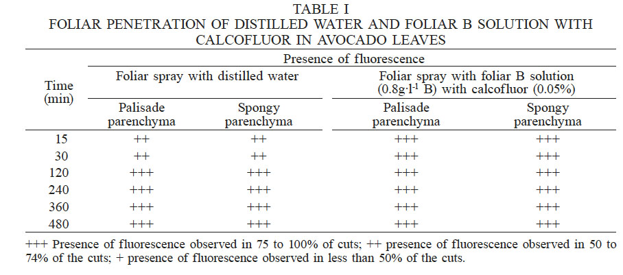 Foliar penetration of B occurred in avocado leaves, but due to the natural fluorescence of the leaf, it was not possible to distinguish the path followed by the fertilizer, nor the time needed for absorption. Such penetration may be passive, given that the H3BO3 molecule is neutral.
