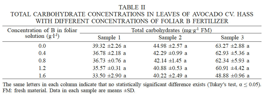 Despite the lack of significant differences, the highest concentrations were recorded in the control treatment. In the third sampling, the carbohydrate concentration obtained in plants treated with 1.6g·l-1 B represented 77.3% of concentration determined for the control. These results may be a consequence of the transport of carbohydrates for flower bud formation, which is of great importance in avocado. Boldingh et al. (2016) showed that in the case of the cultivar Hass, carbohydrate and B contents of flowers at anthesis have a negative effect on the potential of flowers to set fruit, while successful fruit set represented higher levels of starch and all individual sugars in the styles.