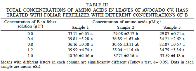 The analysis of variance of the amino acid concentrations obtained in the first and third samplings showed no statistically significant differences among the treatments (Tukey’s test, α ≤0.05). In sampling 2, differences between the 1.6g·l-1 B treatment and the control were observed (Table III).